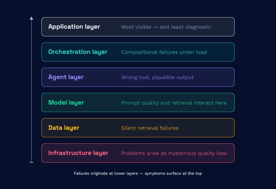 The challenge is that a production AI system is not a single thing you monitor from a single vantage point, it's a layered architecture. As a result, if something breaks in one location and makes itself known in another–which may not be the case with especially subtle and silent errors–it will often do so in a form that makes tracking it back to its origin incredibly difficult.