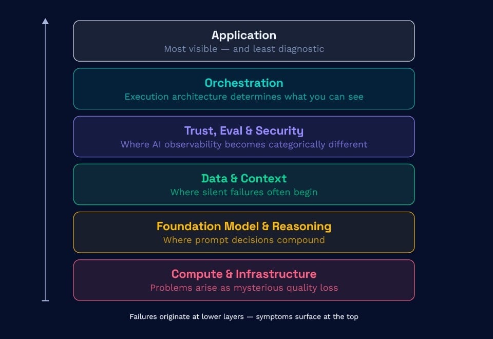 The AI application layer rarely tells you what's wrong, but it's often the first place you know that something has gone off the rails, which makes it the correct starting point for a diagnostic workflow that then traces downward through the stack.